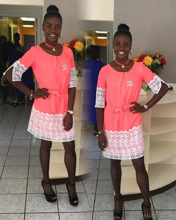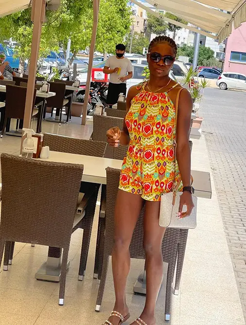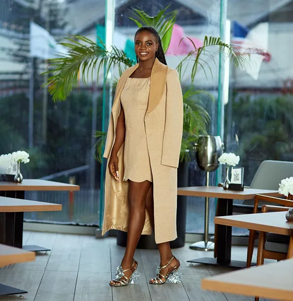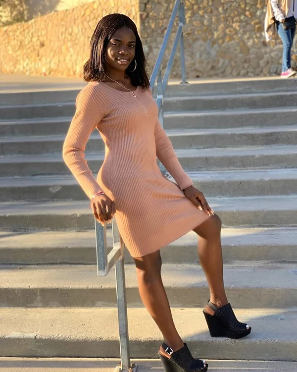 20-year-old Amusan looks cute in a peach lightweight dress with lace at the hem.
