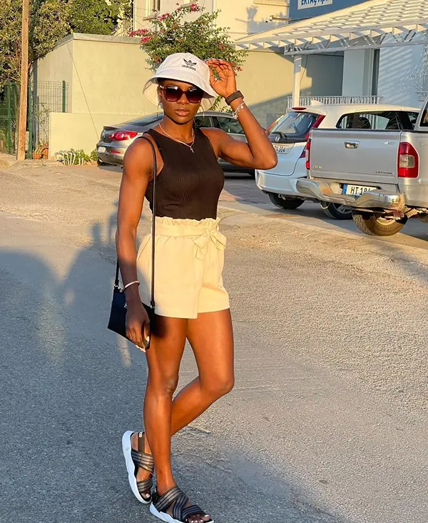 Amusan takes a walk in the sunset. She pairs her chic outfit with an Adidas original bucket hat and an Adidas women’s 90s’ Fit Swim Slide Sandals.