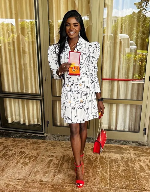 Amusan looks like a walking art painting in her stylish blazer dress. She receives the Officer of the Order of the Niger OON emblem.