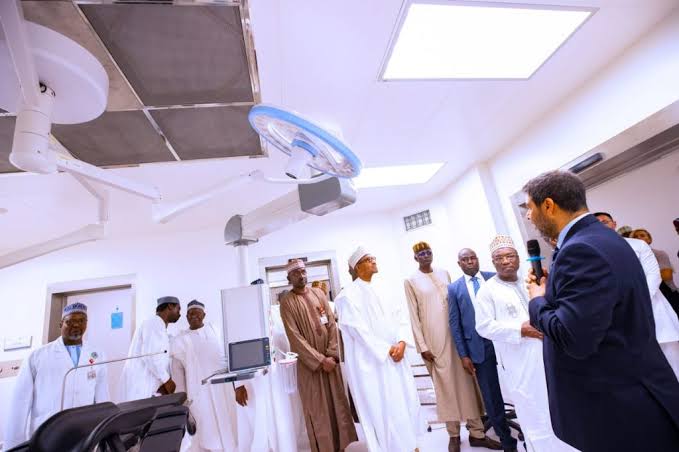Accompanied by the First Lady, Dr. Aisha Buhari, members of the first family, Senate President Ahmed Lawan, Chief of Staff Prof Ibrahim Gambari, and the Permanent Secretary of the State House, Tijjani Umar, the President toured the Cardiac Catheterization Laboratory (CathLab), Operating Rooms for regular and specialized procedures, Intensive Care Unit, Specialized Infectious Disease Isolation Suites, and Specialized consultation rooms.