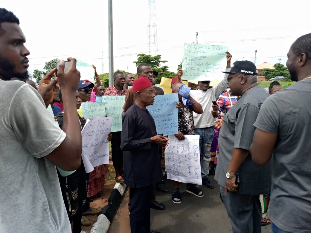 People of Owelle community in Anambra West Council Area on Tuesday besieged the State Government House, Awka, in protest over the removal of their Traditional Ruler, Igwe Anthony Onyekwere by former governor of Anambra State, Chief Willie Obiano and the alleged imposition of Mr Raymond Onoja on them.