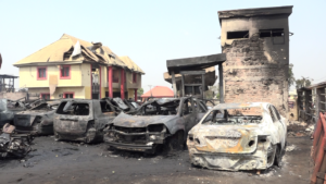 The fire incident which happened Sunday night at about 8pm, had started at one of the filling stations before escalating to another nearby station and a mechanic workshop where over 15 vehicles were gutted by fire.