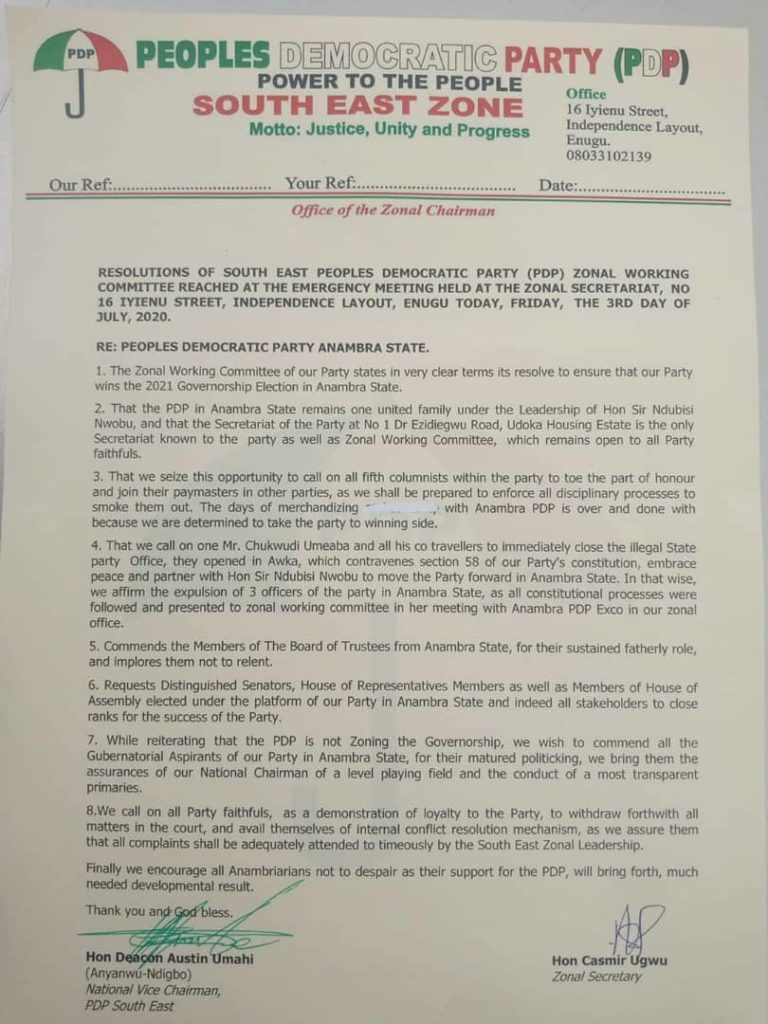 The resolution affirmed the expulsion of the three officers of the party in Anambra state, as according to it, ‘all constitutional processes were followed and presented to the zonal working committee in her meeting with Anambra PDP Exco.