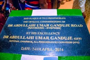 The National Chairman of the All Progressives Congress (APC), Dr. Abdullahi Umar Ganduje, made an appearance in Gombe on Wednesday for the commissioning of a road constructed under the administration of Governor Muhammadu Inuwa Yahaya.