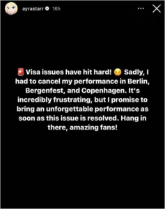 Due to visa complications, Ayra Starr, who is presently on tour, had to cancel her appearances in Berlin, Bergenfest, and Copenhagen.