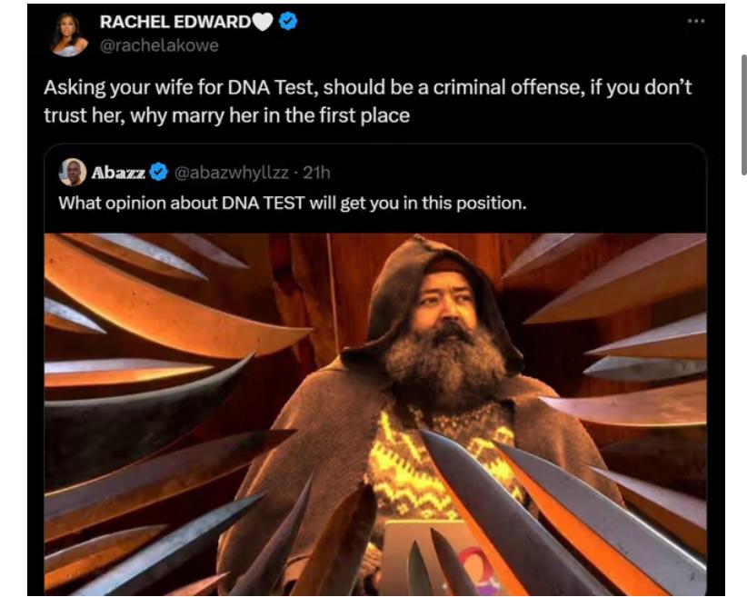 On Sunday, March 24, 2024, the actress responded to a tweet which read, “What opinion about DNA TEST will get you in this position?” with the response, “Asking your wife for a DNA Test should be a criminal offence, if you don’t trust her, why marry her in the first place?”