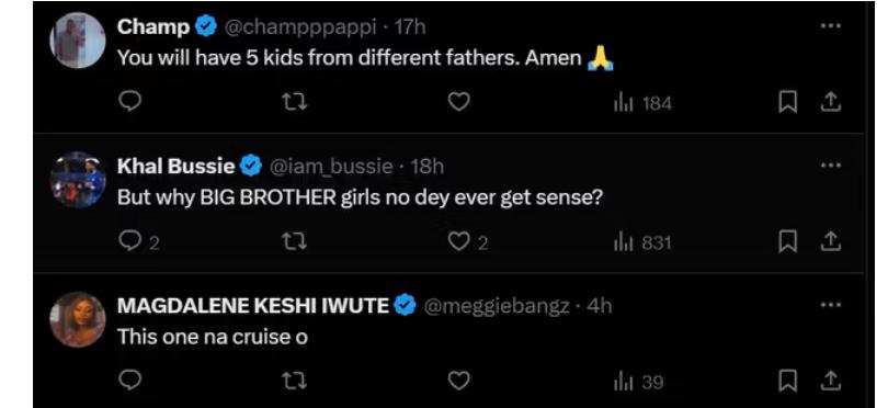 Another user said, “BBN girls no de ever get sense, not surprised” and another user commented, “If person tap your head e go echo, nothing Dey inside”