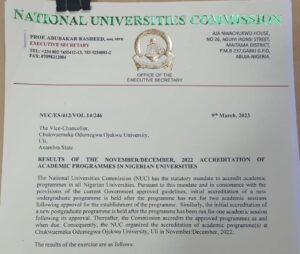 In a memo dated 9th March 2023, delivered to the Vice Chancellor of the University, Prof. Greg Nwakoby, signed by Arc. S.S Ikani, Deputy Director, Programme Accreditation on behalf of the Executive Secretary of National Universities Commission, the Commission revealed that out of the twenty-one programs that were accredited in the exercise, a total of twenty programmes had “Full Accreditation” status.