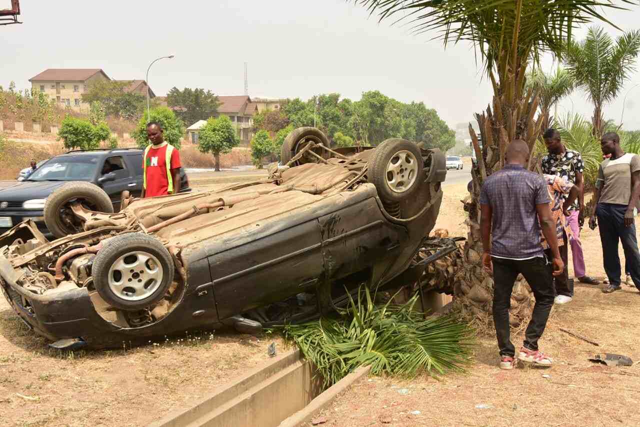 Report coming in has it that a driver and four passengers travelling from Zuba to Garki Area 1 in the Federal Capital Territory, Abuja, narrowly escaped death when a car somersaulted on Tuesday, February 20th.
