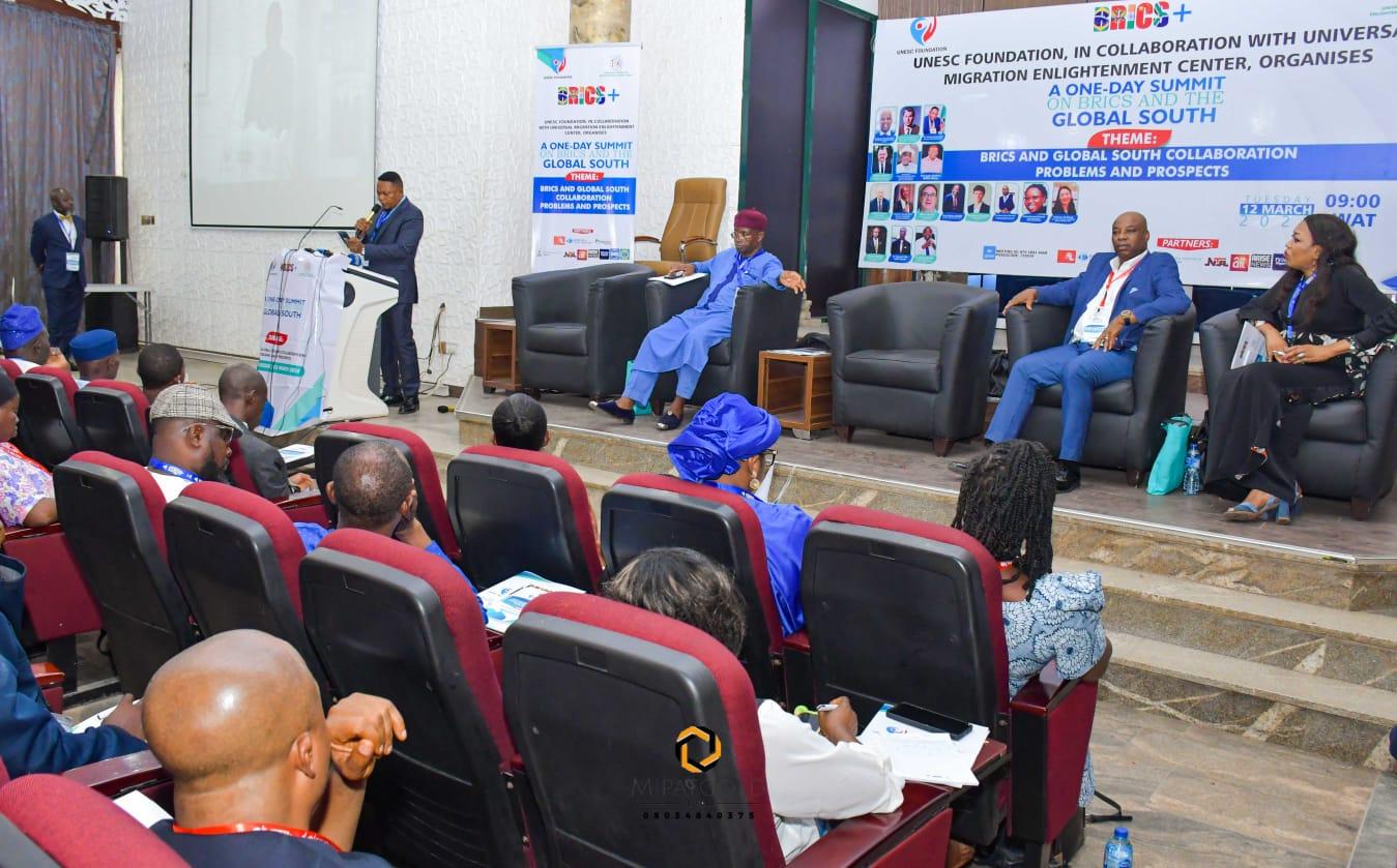 He spoke at a one-day summit on BRICS themed ‘BRICS + and Global South: Problems and Prospects’ organized by Upriver Needy’s Empirical Solution Centre (UNESCO), Foundation in partnership with the Universal Migration Enlightment Centre (UMEC) in Abuja, Nigeria.