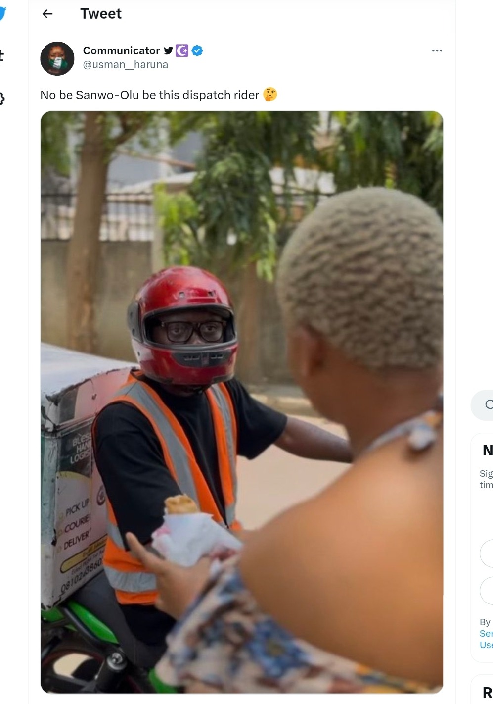 Findings by the News Chronicle show that the image was doctored. Further checks on the footage revealed that the video is a comedy skit. In the footage, the dispatch rider later removed his helmet which shows that it’s a different person and not Babajide Sanwo-Olu as claimed in several social media posts.
