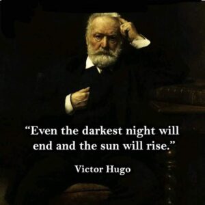Victor-Marie Hugo a French poet, novelist, essayist, playwright, and dramatist of the Romantic movement. During a literary career that spanned more than sixty years, he wrote abundantly in an exceptional variety of genres: lyrics, satires, epics, philosophical poems, epigrams, novels, history, critical essays, political speeches, funeral orations, diaries, and letters public and private, as well as dramas in verse and prose. He posited; “Even the darkest night will end and the sun will rise.” – Les Misérables