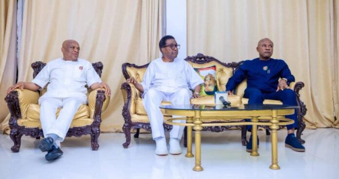 As political alignments and realignments continue ahead of 2027 general election, elder statesman and former civilian governor of old Anambra State, Chief Jim Nwobodo has hosted Enugu State Governor, Dr. Peter Mbah, and Senator Orji Uzor Kalu at his country home, Amechi Awkunanaw, Enugu.