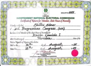 The Independent National Electoral Commission (INEC) has presented a Certificate of Return to the newly elected member of Karim 1 State Constituency in the Taraba State House of Assembly, in line with provisions of the Electoral Act 2022.
