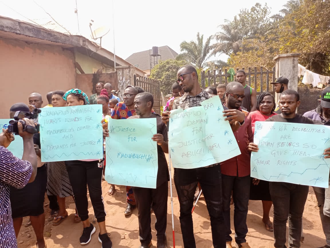 Members of the Joint National Association of Persons with Disabilities (JONAPWD) Anambra State Chapter over the weekend, stormed Ekwulobia in Aguata Council Area of the state, the country home of late Mr. Mmadụabuchi Nnofu, to demand justice for the deceased.