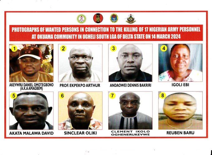 The Nigerian Army has declared eight persons comprising seven men and a woman wanted in connection with the killing of seventeen of its officers in the Okuama community in Delta state on March 14.