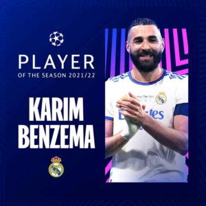 The UEFA technical panel has chosen Karim Benzema as the player of the season for 2021-22. The French man ended the 2021-22 European campaign with 15 goals and 2 assists in 12 appearances, making him the top scorer in the tournament. Karim Benzema spearheaded Real Madrid to their 14th Champions League triumph against Liverpool on Saturday.