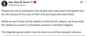 U.S. lawmaker Riley Moore has urged prayers following the abduction of 25 schoolgirls and the killing of their vice principal in a brutal attack in Northern Nigeria.
