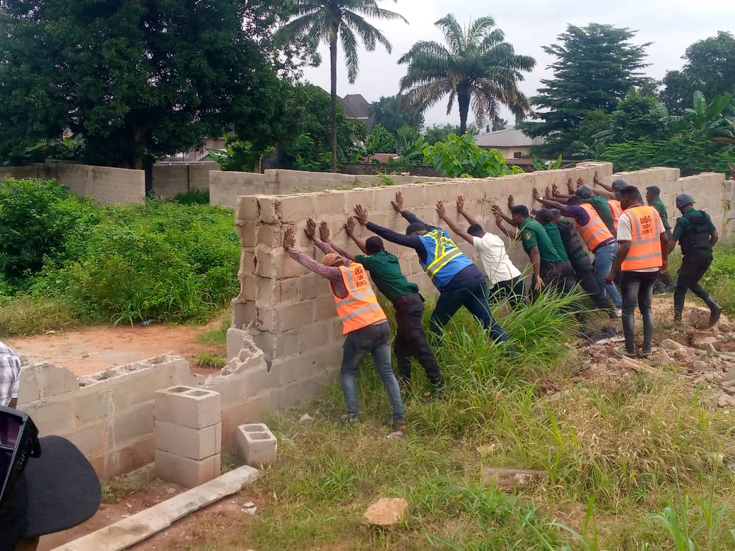 The presence of two massive coffins and charms could not prevent a determined Anambra State Taskforce from demolishing illegal structures built on a government land near Governor’s lodge, Onitsha over the weekend.