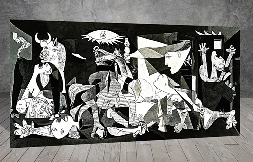 The painting was done in a Picasso style and depicts the German aerial bombing of the town of Guernica in the Basque region during the Spanish Civil War.