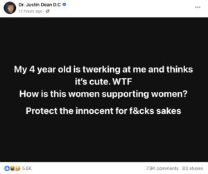 In a post, Dean shared his concern, saying, “My 4-year-old is twerking at me and thinks it’s cute. WTF. How is this women supporting women? Protect the innocent for f&cks sakes.”