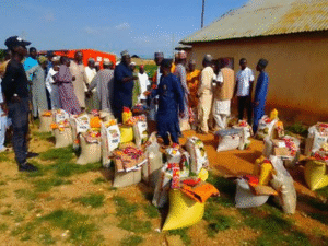 Items distributed included bags of rice, beans, and maize, cartons of vegetable oil, seasoning cubes, tomato paste, children’s clothing, and wax prints, among other essential supplies.