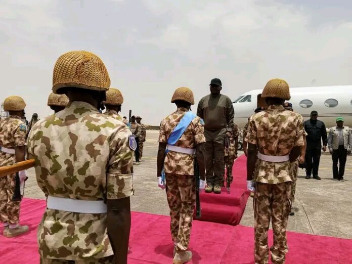 The visit comes amid renewed attacks in parts of Borno, prompting the Defence Minister to engage directly with frontline troops at the headquarters of the theatre command.