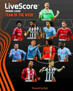 Ola Aina who made an 8.5 rating was joined by teammate Tofollo, Lascelles, four Manchester City players, Ake, Doku, Foden, and Silva. Chong whose goal against Liverpool almost earned Luton Town their biggest victory in the English top-flight league joined Manchester City trio Foden, Silva, and Doku in the midfield. Archer and Gordon Lead the attack of the team of the week as compiled by Livescore.