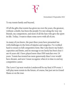 Swizz great, Roger Federer has disclosed his plans to retire later this month after he participates in the Laver Cup in London. He has been sidelined since Wimbledon 2021 due to an injury he sustained. Only Spain’s Rafael Nadal, with 22 majors, and Serbia’s Novak Djokovic, with 21, have more men’s Grand Slam singles titles than Federer.