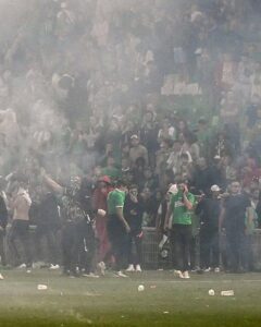 Saint Etienne fans invaded the stadium yesterday after their club lost on penalties to Auxerre in a relegation/promotion playoff. Their inability to win the game means they will start next season’s campaign in Ligue two. The invasion was observed immediately after the referee ended the game, with fans seen running after players and throwing heavy fireworks at them.