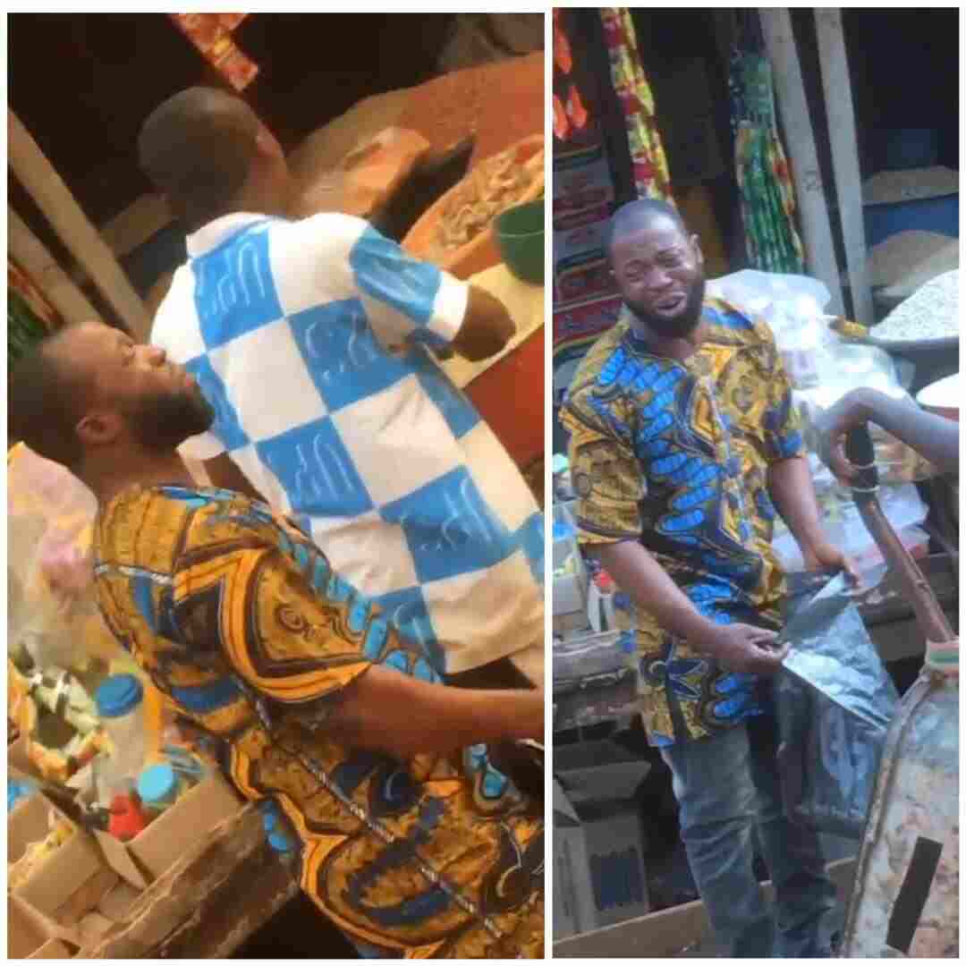 In the viral video apparently filmed in front of a shop where staple food items such as Rice, Beans, Garri and others were being sold, the yet-to-be-identified man was seen asking for the prices of the food items.