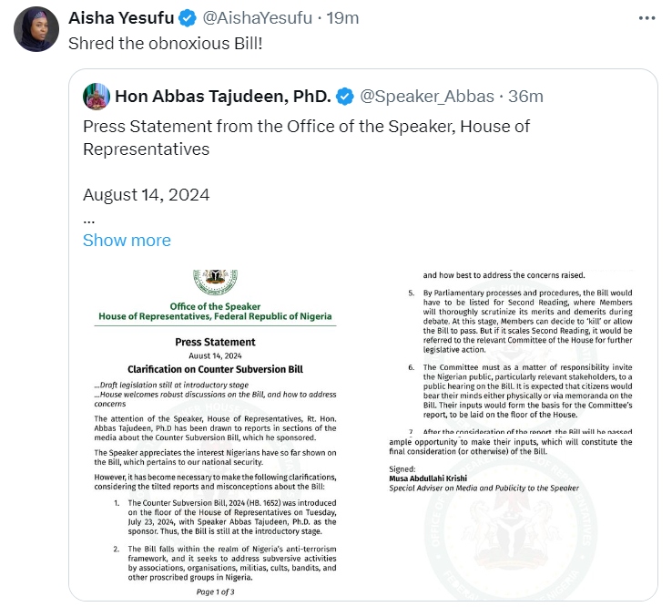 Hours later she posted again on X alongside the statement from the Office of the Speaker, House of Representatives: “Shred the obnoxious Bill!”